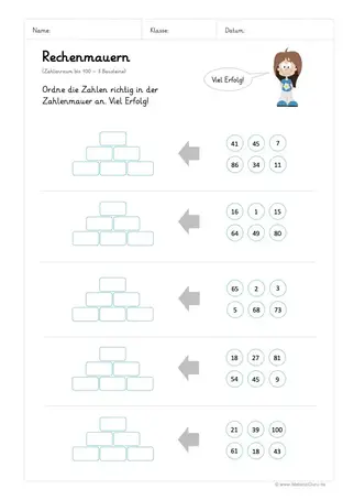 Unsere Aufgabenblätter enthalten einfache Aufgaben (3 Grundsteine, bis ) sowie schwierig zu lösende Zahlenmauern (4 Grundsteine, bis 1000) So ist für die Schüler der Klassen 2,3,4 jeweils etwas Geeignetes zu finden Sie können die Blätter kostenlos ausdrucken und dem Schüler zum Ausfüllen vorlegen. Klasse, der Zahlenraum bis In der 2 Klasse der Grundschule erweitern die Schüler den Zahlenraum bis 100 Für den Zahlenraum bis 100 müssen die Kinder die Zahlen ordnen, die Zahlen auf dem Zahlenstrahl eintragen, Nachbarzahlen und Tauschaufgaben rechnen Außerdem natürlich die Grundrechenarten im Zahlenraum 100 rechnen Zahlenmauern. Zahlenmauer mit 3 Grundsteinen online üben Zahlenmauern mit auswählbaren Optionen Zahlenmauer mit 4 Grundsteinen online üben Zahlenmauern mit auswählbaren Optionen.