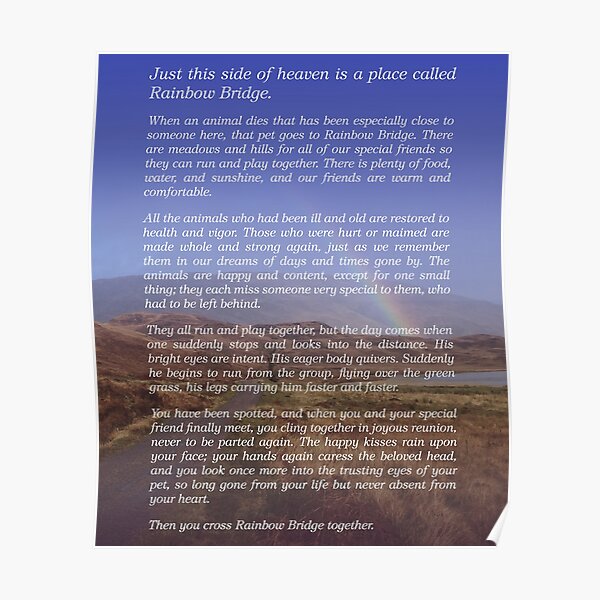 Wenn die Sonne des Lebens untergeht, leuchten die Sterne der Erinnerung!. Ich bin bemüht, sämtliche Rechte anderer einzuhalten Sollte es dennoch einmal zu einem Verstoß kommen, bitten ich euch, mich umgehend darüber zu informieren. Dieses Rainbow Bridge Poem ist zum sofortigen Download (Sie erhalten keine physische Kopie) Sie erhalten Ihre Datei als JPEG, so dass Sie in jeder beliebigen Größe speichern oder drucken können Unsere Haustiere bedeuten uns so viel und wenn sie uns verlassen, hinterlässt es einen leeren Raum Ich.