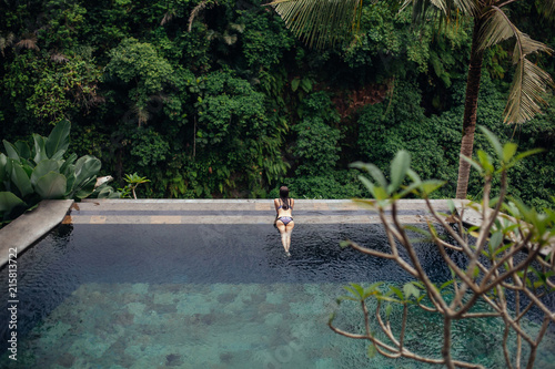 Slim Sexy Brunette Woman In Swimsuit Relaxing On Edge Tropical Infinity Pool In Jungle Palms Around And Crystal Clean Water Luxury Resort On Bali Island Buy This Stock Photo And Explore
