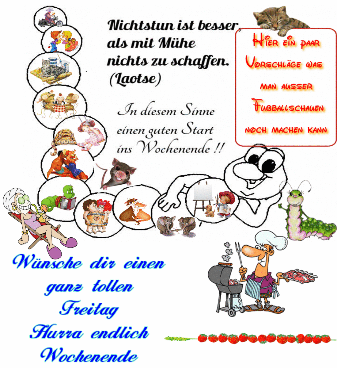 Freitag Bilder Hier findet Ihr die beste Sammlung von Gästebuchbilder, Animationen und Glitzerpics in der Kategorie Freitag Diese Bilder könnt Ihr bei WhatsApp, Jappy, Facebook Seite 9. Wähle einfach das gewünschte Bild aus der Kategorie hurra wochenende bilder und klicke auf einen der darunter angezeigten Codes Dieser wird automatisch. Wähle einfach das gewünschte Bild aus der Kategorie guten morgen lustige bilder freitag und klicke auf einen der darunter angezeigten Codes Dieser wird automatisch markiert und du kannst ihn direkt kopieren und ins Gästebuch oder auf der gewünschten Seite einfügen Nutze dazu am besten die Tastenkombination Strg C zum Kopieren und Strg V.