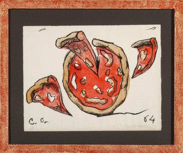 © Claes Oldenburg Flying Pizza, from New York Ten 1964, published 1965 Claes Oldenburg (American, born Sweden, 1929). Color lithograph on BFK Rives;. CLAES OLDENBURG (b 1929) Flying Pizza lithograph in colors, 1964, on Rives BFK paper, signed in pencil, numbered 17/0 (there were also 25 proofs in Roman numerals), published by Tanglewood Press, New York, generally in good condition, framed.