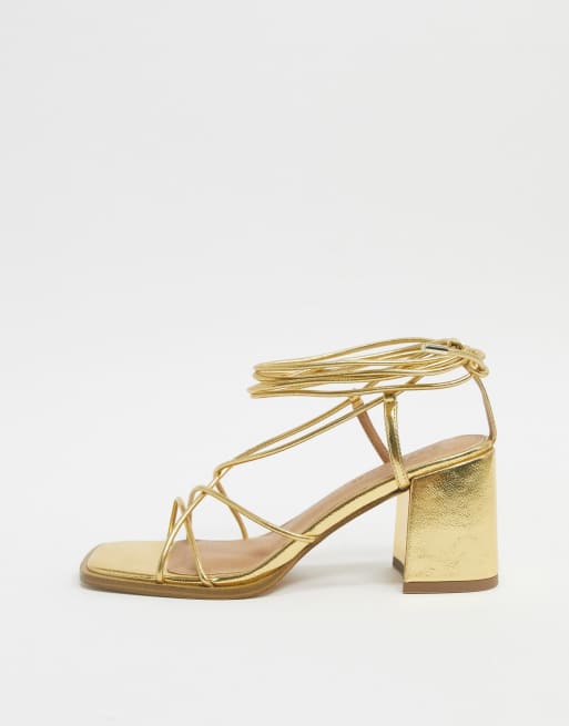 Asos Design Hideout Goldfarbene Sandalen Mit Blockabsatz Und Minimalistischem Riemchendesign Asos