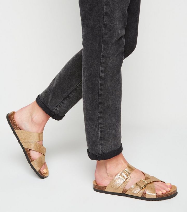 Wide Fit Goldfarbene Sandalen Mit Vorgeformtem Fussbett Und Uberkreuzten Riemchen Mit Schliesse New Look