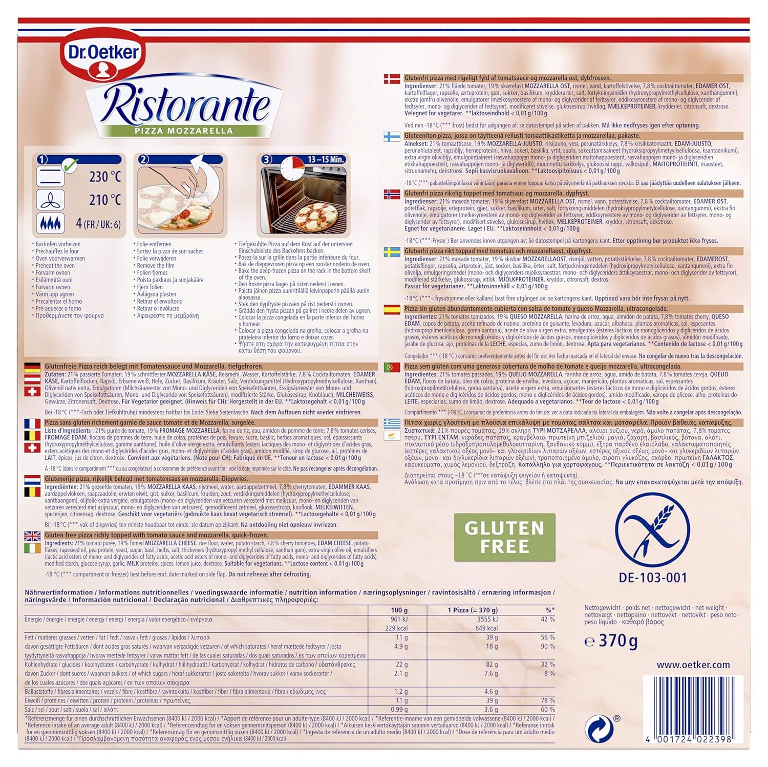 Lactose free** **Lactose content < 001 g/100 g Dr Oetker Ristorante Gluten Free Mozzarella Pizza;. Ingredients Ristorante Salame Gluten Free 24% tomato purée, 15% CHEESE (firmed MOZZARELLA, EDAM), rice flour, 12% salami (pork, pork fat, salt, spices, dextrose, onion powder, garlic powder, spice extracts, antioxidant (extracts of rosemary), stabiliser (sodium nitrite), smoke), water, potato starch, potato flakes, pea protein, rapeseed oil, baker's yeast, sugar, salt, thickeners. Dr Oetker Ristorante Pizza Mozzarella Glutenfrei ist belegt mit sonnengereiften Tomaten, Mozzarella und feinem Basilikum Für den Boden werden von Natur aus glutenfreie Zutaten wie Reismehl, Kartoffelstärke und Erbseneiweiß verwendet Zubereitung 1 Backofen vorheizen Ober/Unterhitze 2°C, Heißluft 0°C, Gas 4 2 Folie entfernen 3.