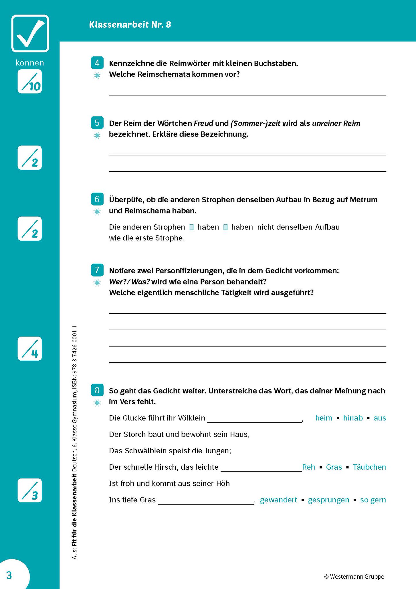 Monate und Jahre hinweg Auchim Fach Deutsch bedarf es der Geduld und der Bereitschaft, rechtzeitig und regelmäßig zu üben Mit jedem Erfolg wächst das Selbstvertrauen und damit auch der Spaß an der Arbeit Ich wünsche Ihnen, dass Ihr Kind mit diesem Buch die nächsten Klassenarbeiten. Klassenarbeiten mit Musterlösung zum Thema Reimschema, Gedichte Klassenarbeiten und Übungsblätter zu Reimschema Kreuzreim, Paarrreim, umarmender Reim. Zum Download & Ausdrucken Schulaufgaben & Klassenarbeiten Gymnasium Klasse 7 Alle Aufgaben mit Lösungen Spezialisiert auf Bayern PDF & WordDokumente.