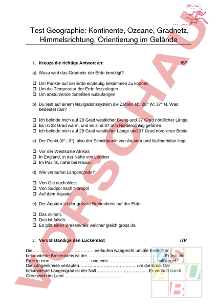 Arbeitsblatt Test Kontinente Ozeane Gradnetz Himmelsrichtung Orientierung Im Gelande Geographie Gemischte Themen