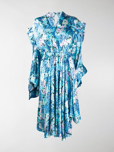 Balenciaga Floral Print Ruffled Satin Midi Dress Blue Multi Luisaviaroma